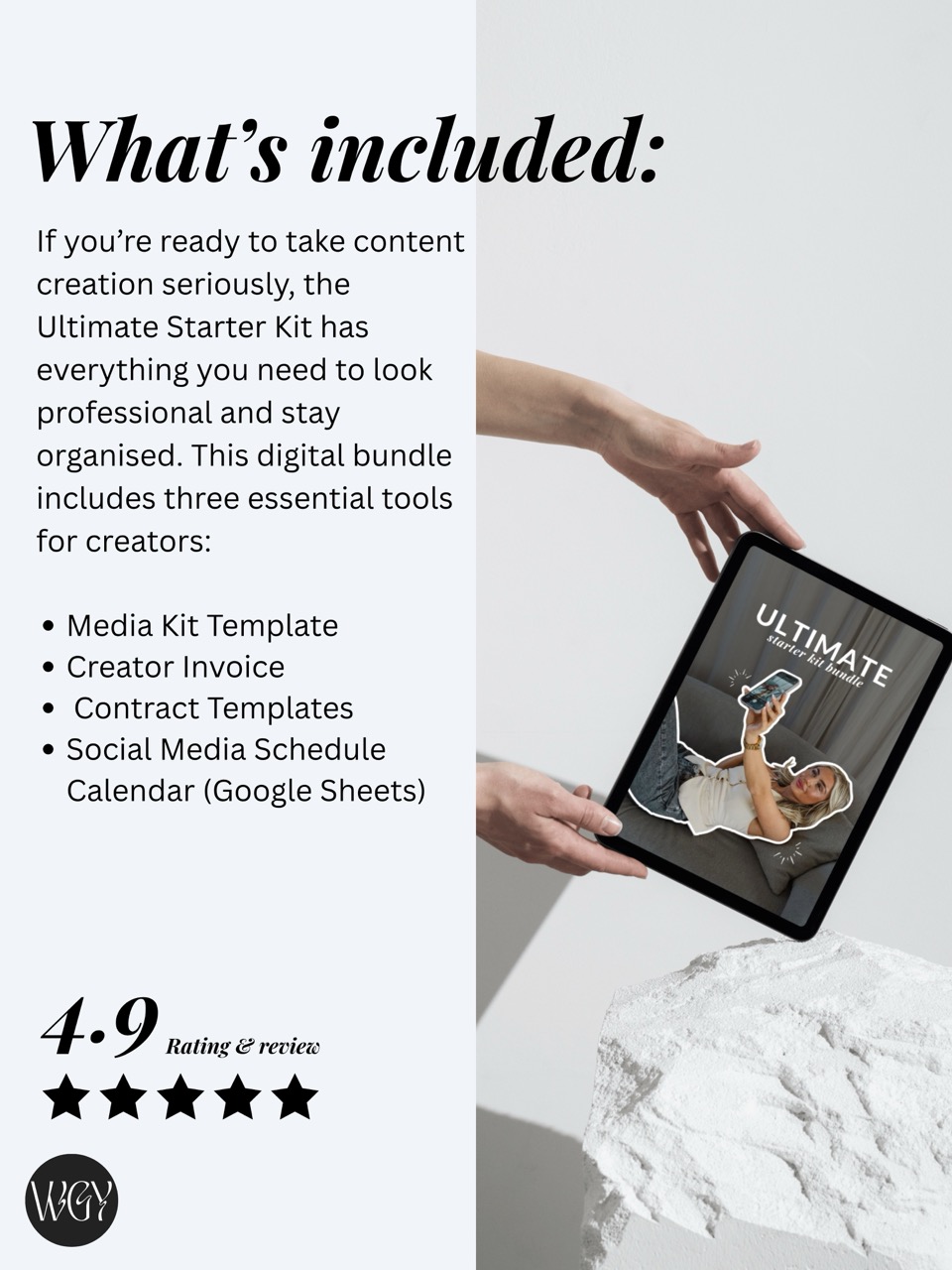 Designed with creators in mind, this kit takes the stress out of admin and helps you present yourself professionally to brands. Download today and get everything you need to manage your creator journey in one simple package.